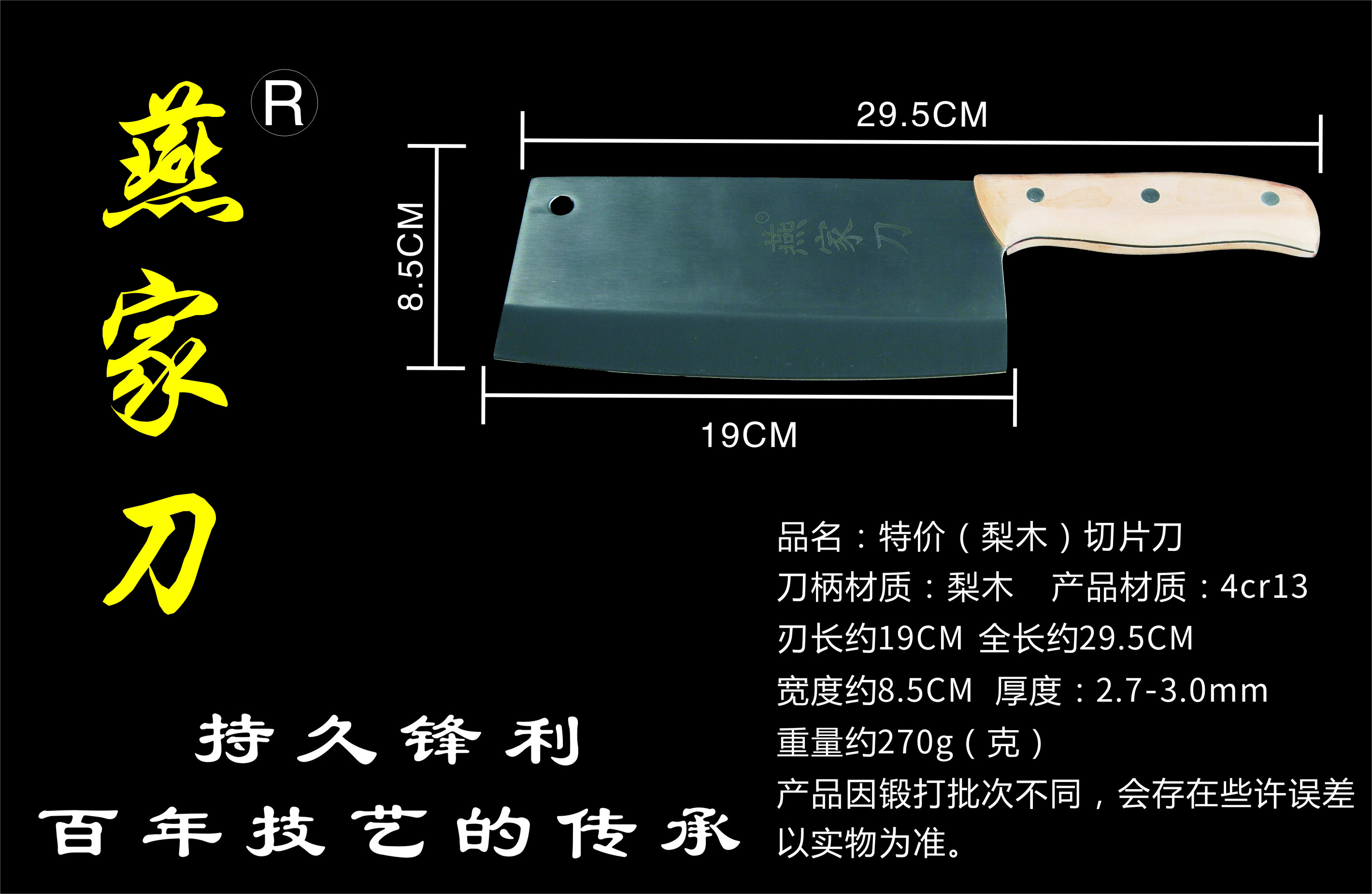 樂山燕家刀具有限公司(公司前身為燕佳鐵匠鋪),公司坐落于美麗的佛都之鄉樂山嘉州,在全國各地有上千家代理經銷點,公司專業銷售、設計、制作各類刀具。秉承一貫鍛造三精要求,即選料精、用料精、工藝精。所選材料全部產自滇東鐵礦優產區。本品牌刀具堅持千挑萬選為材,千錘百煉為刀的手工鍛造工藝宗旨。具有鋒利耐磨、持久耐用,用料上乘,硬度高、韌度強的特點!